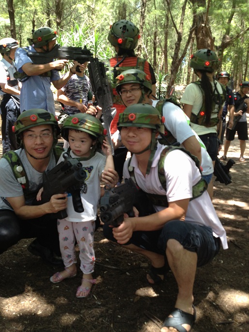 由于大家第一天玩得比较累,于是第二天早上,大家都睡得比较迟才起床。起床吃完早餐后,大家一起去昨天那个淡水涌海滨浴场附近玩CS游击战,我们要照看小孩的大人就没办法参与,其他都加入了“打战”系列,分两组:警察、土匪,湘平为警察队长,张经理为土匪队长。首先,教练教我们怎么玩这个游戏,还是了大家的枪法;然后,讲了游戏的规则和技巧;最后,比赛开始,3局2胜的方法,15分钟一局。第一局,很快双方的人员陆陆续续倒下了,剩下的几分钟,土匪队长和两个警察对峙,还差一分钟,土匪队长干掉了一个警察,这样土匪就赢了一局;这时候,教练又教了我们一个技巧:不要躲在沙包后面,头露出来更容易被敌人发现和射击,躲在树后可以隐藏身上的危险点。第二局,双方换位置,这次一开始,土匪就占了上风,很快就把警察一个一个地消灭了,只剩下一两个“顽固分子”,土匪当然不会放弃,地毯式的搜索,终于把“顽固分子”给消灭了,土匪获得全胜。本来还有一局的,当然太阳很大,大家跑得比较累,汗流浃背,就不玩了。休息了半个小时后,回酒店退了房间,就去吃中午饭,准备回广州了。